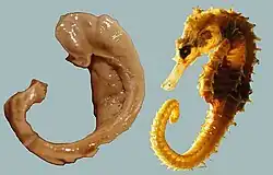 Another reference appeared with the term pes hippocampi, which may date back to Diemerbroeck in 1672, introducing a comparison with the shape of the folded back forelimbs and webbed feet of the mythological hippocampus, a sea monster with a horse's forequarters and a fish's tail. The hippocampus was then described as pes hippocampi major, with an adjacent bulge in the occipital horn, described as the pes hippocampi minor and later renamed as the calcar avis.[5][7] The renaming of the hippocampus as hippocampus major, and the calcar avis as hippocampus minor, has been attributed to Félix Vicq-d'Azyr systematising nomenclature of parts of the brain in 1786. Mayer mistakenly used the term hippopotamus in 1779, and was followed by some other authors until Karl Friedrich Burdach resolved this error in 1829. In 1861 the hippocampus minor became the centre of a dispute over human evolution between Thomas Henry Huxley and Richard Owen, satirised as the Great Hippocampus Question. The term hippocampus minor fell from use in anatomy textbooks, and was officially removed in the Nomina Anatomica of 1895.[8] Today, the structure is just called the hippocampus,[5] with the term Cornu Ammonis surviving in the names of the hippocampal subfields CA1–CA4.[9]