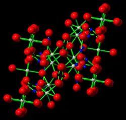 Widgiemoolthalite is a nickel(II) carbonate that has undergone mineral hydration. Tests by Nickel, Robinson, and Mumme yielded the chemical formula (Ni,Mg)5.00(CO3)4.15-(OH)1.70·5.12H2O. The researchers observed that widgiemoolthalite is the nickel structural analog to the hydrated magnesium carbonate hydromagnesite and considering this relationship, determined that widgiemoolthalite's ideal makeup is Ni5(CO3)4(OH)2·4-5H2O though because it may contain either nickel or magnesium, widgiemoolthalite's makeup may also be written (Ni,Mg)5(CO3)4(OH)2·5H2O.[3][10] By weight, the mineral is 49.58% oxygen, 34.41% nickel, 8.05% carbon, 6.11% magnesium, and 1.86% hydrogen.[11] As of 2016, the exact crystal structure of widgiemoolthalite was not known though based on the patterns produced when the mineral was analyzed with X-ray crystallography, a high degree of structural disorder was suspected (possible structure pictured in Figure 2).[12][13] Under an optical microscope, Nickel, Robinson, and Mumme noted difficulty discerning individual crystals as their lateral dimensions were too small.[3]