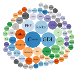 Из рисунка видно, что самыми исторически богатыми на форматы и расширения файлов являются такие языки программирования, как: C++ (10 форматов), Geometric Description Language (GDL) (8), Racket (7). Например, файлы с программой на языке Racket могут иметь расширения rkt, rktl, rktd, scrbl, plt, ss или scm.