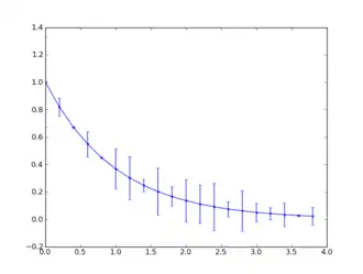 Итак, с помощью функции arange() мы создали массив точек x от 0 до 4 с шагом 0.2. Далее получили массив точек y, отвечающих за значения функции exp(-x). Эти действия ничем не отличаются от тех, что мы делали раньше, когда строили графики кривых. В следующей мы вносим случайные ошибки: определяем размера массива y, составляем для него соответствующий массив гауссово распределенных вокруг нуля случайных чисел, функция abs() берет от них модуль, так чтобы все числа были неотрицательными и домножаем на 0.1, так чтобы эти ошибки не были слишком большими для нашего графика.
