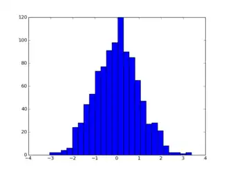 Как мы видим, в отличие от ранее применяемой функции plot() для кривых, используется hist() ( histogram). Первым аргументом она принимает массив чисел, вторым необязательным аргументом является число полос, на которые будет разбит массив. По умолчанию это число равно десяти, мы присвоили ему значение 25.