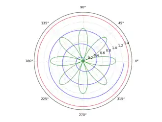 Для построения в полярных координат используется функция polar(). В аргументах первыми идут углы, потом радиусы. В следующем примере мы используем один и тот же массив для углов и радиус-векторов и рисуем три разные кривые. Первая образует спираль, поскольку с каждым новым углом меняется и радиус, вторая рисует цветок в соответствии с уравнением розы (вы уже могли заметить, что в numpy, поскольку он является математическим модулем, имеются и математические функции, например, косинус), последняя представляет собой окружности ввиду неизменности радиуса для всех углов (в данном случае он равен 1.4).